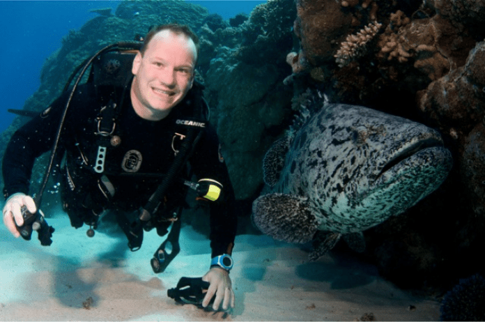 James – lover of all things feathered, furred and finned – and his mate the grouper.